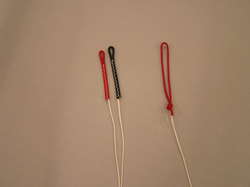 Finish by either sewing as shown on left hand pair, or make an overhand knot as shown in red on the right.